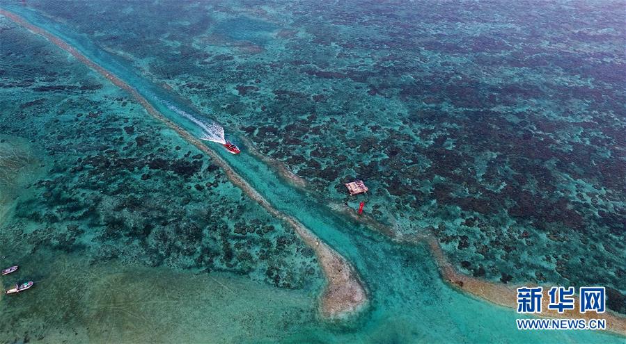 一条船驶入西沙晋卿岛的航道(2017年4月23日无人机拍摄)。新华社记者 郭程 摄