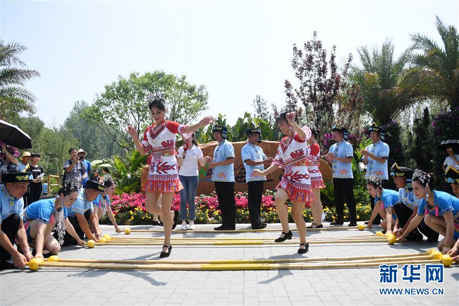 7月21日,演职人员在北京世园会海南园表演竹竿舞。新华社记者 张晨霖 摄