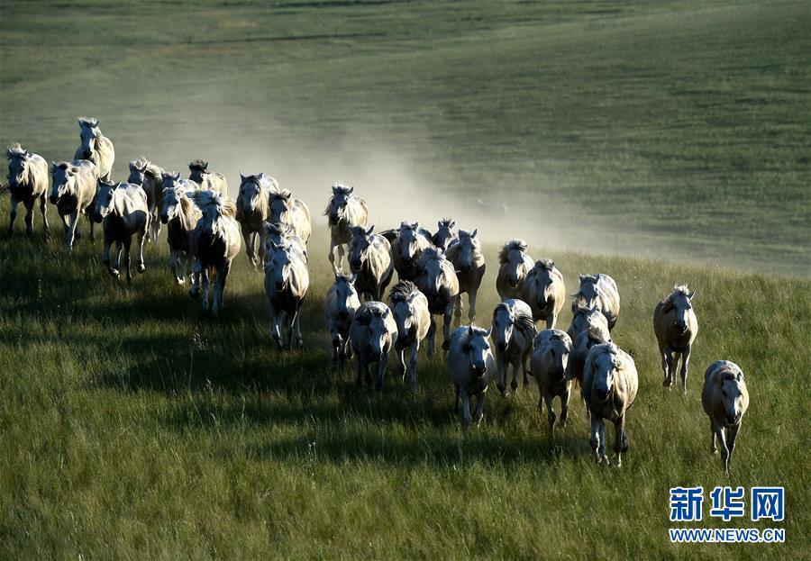 7月21日,一群白马从草原上跑过。 当日,内蒙古西乌珠穆沁旗在巴彦胡舒苏木白马繁育基地的草原上进行套马活动,向广大游客展示蒙古族高超的套马技艺和独具风情的草原民俗文化。 新华社记者任军川摄