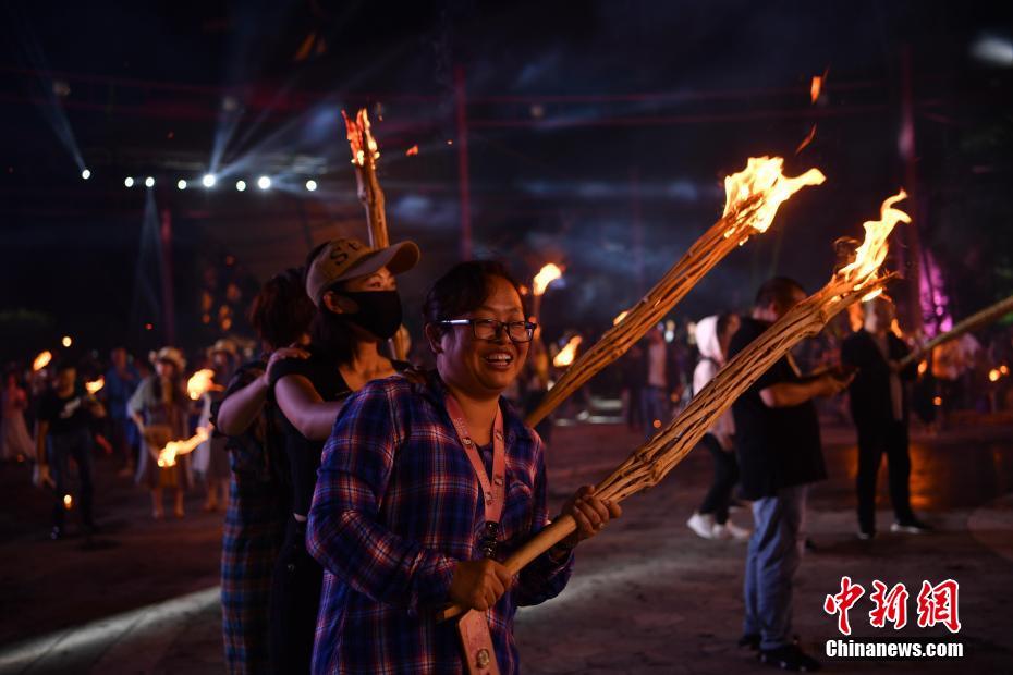 7月21日,火把节现场欢乐的游客。当日晚,云南民族村举行2019昆明火把节狂欢活动,来自各地的游客踩着欢快的音乐,在火的海洋中与少数民族民众一起共度“东方狂欢节”。火把节是彝族、白族、纳西族、拉祜族、哈尼族、普米族等民族的传统节日,在农历六月举行,节期二至三天。 中新社记者 刘冉阳 摄