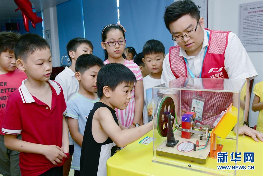 7月22日,社区里的孩子们在志愿者指导下体验科学实验教具。 当日,浙江省慈溪市“钱海军志愿服务中心”的青年志愿者来到剑山社区,给社区里的孩子们带去多种科普教具,让孩子在体验中感知科学的奥秘、学习暑期安全知识和急救技能,过一个安全、快乐、充实的暑假。 新华社记者 徐昱 摄