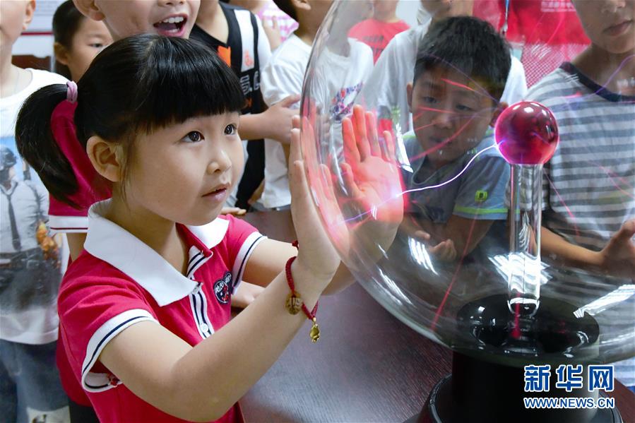 7月22日,社区里的孩子们在志愿者指导下体验科学实验教具。 当日,浙江省慈溪市“钱海军志愿服务中心”的青年志愿者来到剑山社区,给社区里的孩子们带去多种科普教具,让孩子在体验中感知科学的奥秘、学习暑期安全知识和急救技能,过一个安全、快乐、充实的暑假。 新华社记者 徐昱 摄