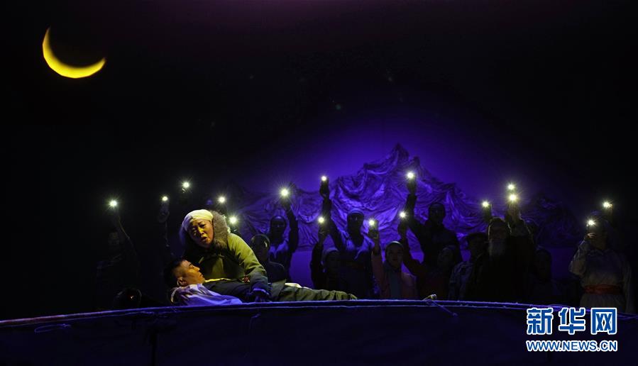 7月22日,在内蒙古苏尼特右旗,苏尼特右旗乌兰牧骑演员表演舞台剧“朱日和情”。新华社记者 才扬 摄