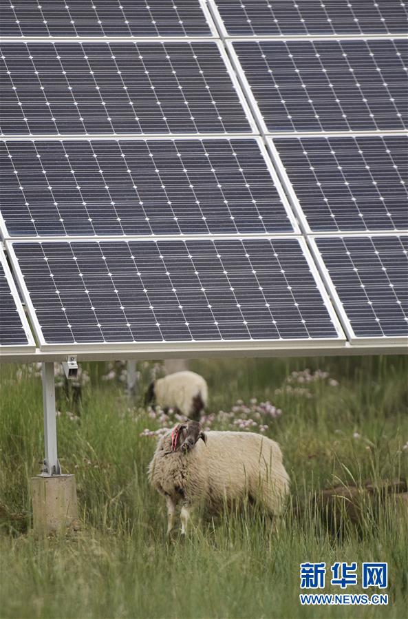 6月16日,羊群在光伏园区内吃草。新华社记者 吴刚 摄