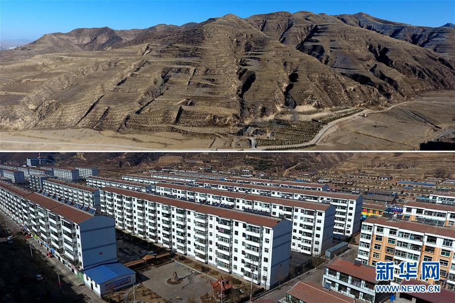 拼版照片:上图为已被拆除复垦的山西省岢岚县赵家洼村(2018年2月12日摄);下图为岢岚县广惠园小区一角,包括刘福有一家在内的部分赵家洼村村民被安置到这里(2018年2月13日无人机拍摄)。 新华社记者 詹彦 摄