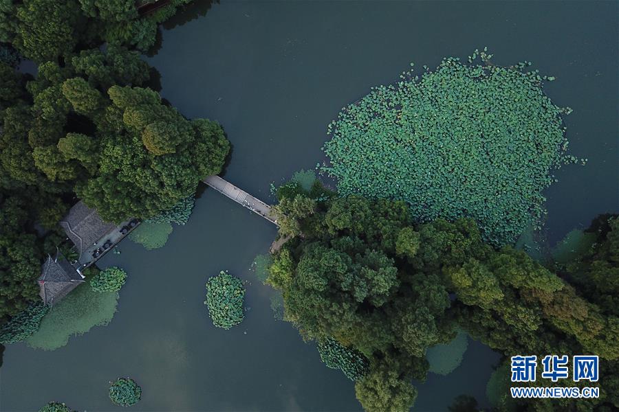 7月22日,游客在西湖曲院风荷景区游玩(无人机拍摄)。 正值盛夏,杭州西湖景区荷花盛开,已进入最佳观赏期,吸引大批市民和游客前来观赏。 新华社记者 黄宗治 摄