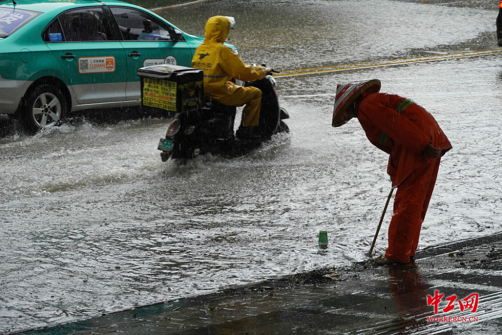 南宁遭受雷电强降雨袭击 环卫工人雨中坚守排水忙