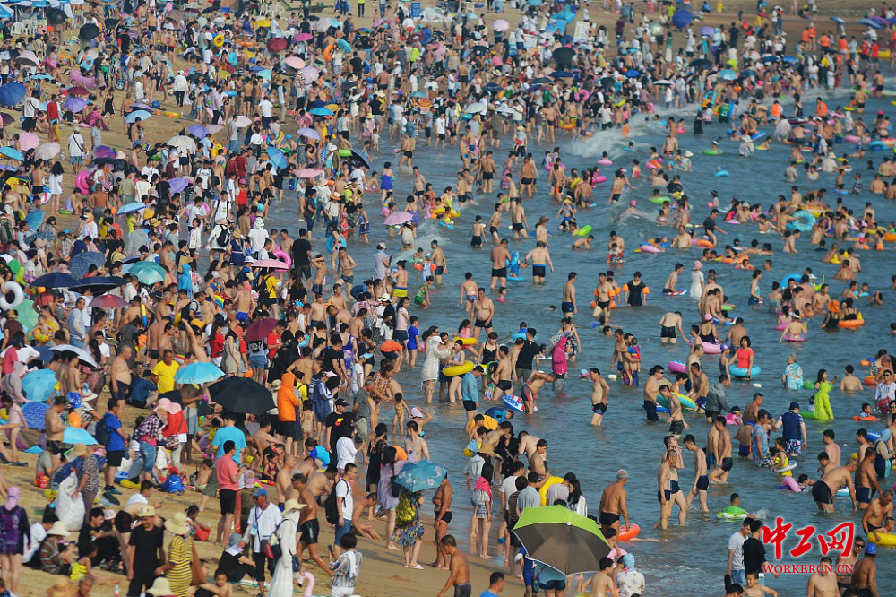 2019年7月21日,山东青岛开启“烧烤模式”,众多游客来到海边戏水纳凉,第一海水浴场游客爆满。王海滨/视觉中国
