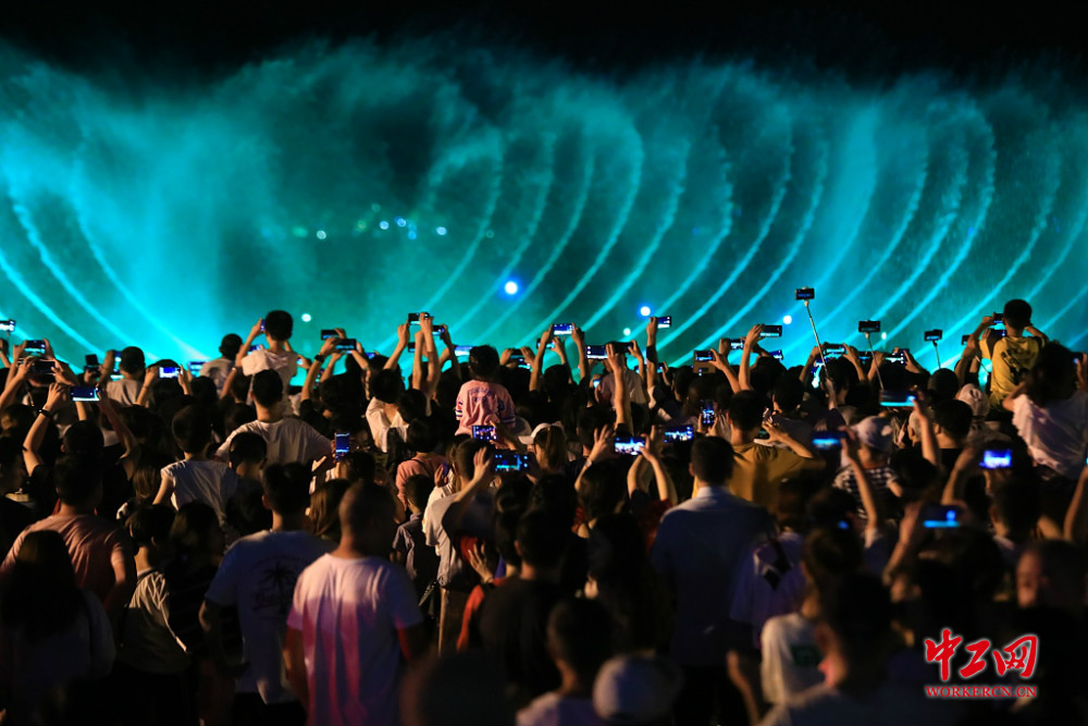 2019年7月7日晚,位于杭州湖滨三公园的西湖音乐喷泉吸引了不少游客前来观赏。浙报传媒/视觉中国