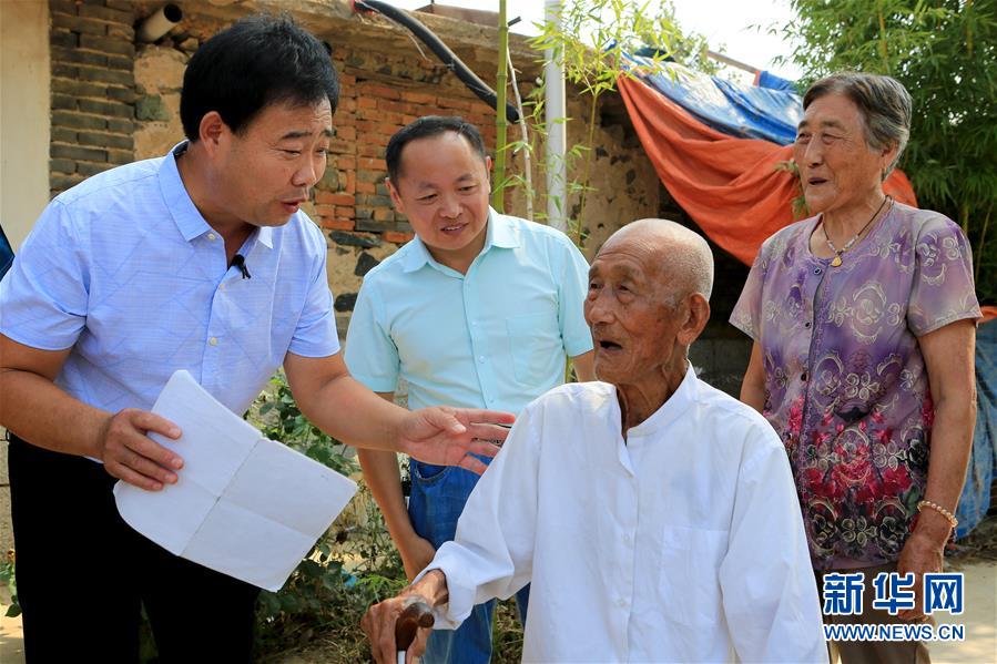 7月18日,在蓬莱市北沟镇阎家村,张景宪(左一)拿着烈士名单向“活烈士”阎寿光介绍情况。新华社记者 王南 摄