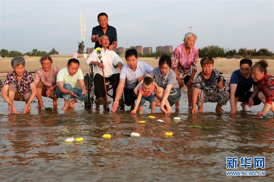 7月18日,在蓬莱市八路军挺进东北渡海出发地纪念广场前,张景宪(右七)、“活烈士”阎寿光(左四)及其后代撒下鲜花,祭奠1947年菏泽战役牺牲的烈士。新华社记者 王凯 摄
