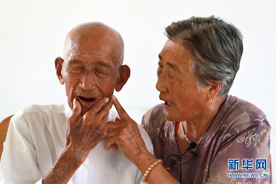 7月18日,在蓬莱市北沟镇阎家村,“活烈士”阎寿光的大女儿阎巧英(右)在指着老人作战时负的枪伤。新华社记者 郭绪雷 摄