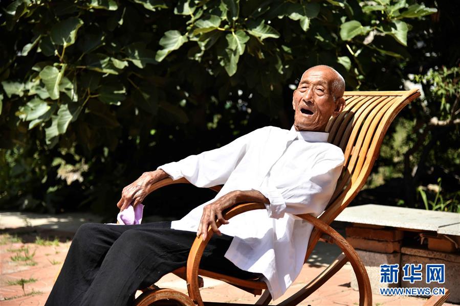 7月18日,在蓬莱市北沟镇阎家村,98岁的“活烈士”阎寿光在躺椅上休息。新华社记者 王凯 摄