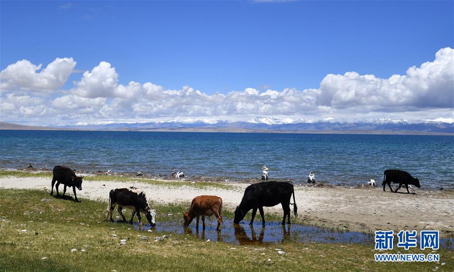 这是7月21日在玛旁雍错湖边拍摄的牛。 玛旁雍错湖位于西藏阿里地区的普兰县境内,海拔4588米,面积412平方公里,四周雪山为湖泊常年补水,是著名的旅游胜地。 新华社记者 觉果 摄