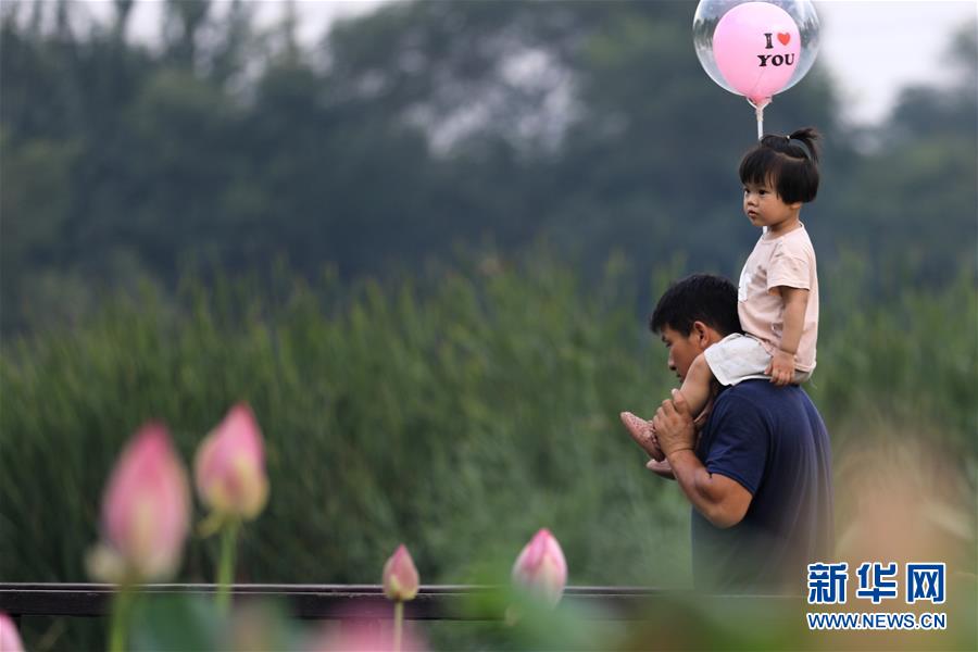 7月22日,一位父亲和女儿在前关湿地公园里游玩。新华社记者 姚剑锋 摄