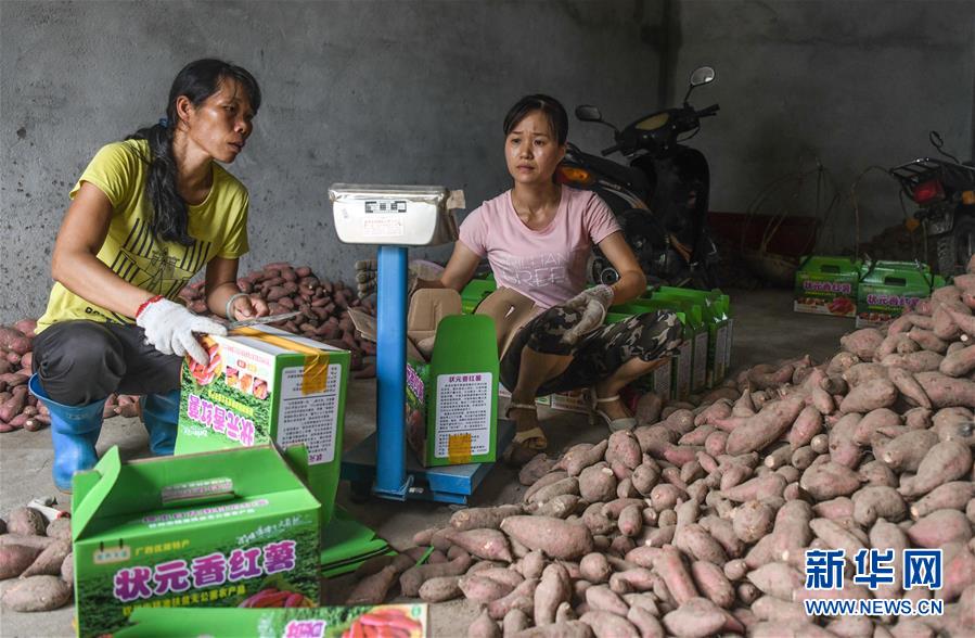 7月23日,钦州市钦南区犀牛脚镇西寮村群众将收获的红薯装箱准备外销。 广西钦州市钦南区犀牛脚镇西寮村是一个贫困村。近年来,驻村工作队与村里的贫困群众一起谋划,利用村里盐碱地富含硒等微量元素这一特性,大力发展红薯种植。目前,西寮村种植的100多亩红薯正值收获季节,预计可收入15万多元,助力贫困户脱贫。 新华社记者 张爱林 摄