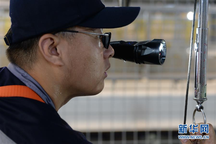7月23日,合肥南动车运用所的工作人员在车间内检测动车组部件。 近日迎来暑运高峰,合肥南动车运用所的工作人员每天对配属的80组动车组列车进行检修和维护,确保暑运期间列车安全运行。 由于合肥连日持续高温,动车运用所车间内的温度最高将近50摄氏度,工人们戏称“边蒸桑拿边工作”。 新华社发(黄博涵 摄)