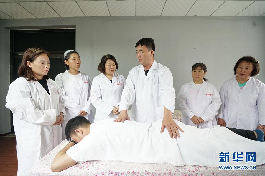 7月23日,河北省滦州市滦河街道一所家政培训机构的老师(后右三)向学员们演示按摩技巧。 近年来,河北省滦州市滦河街道办事处依托辖区内的家政培训机构和培训基地,免费为有就业需求的妇女开展育婴、护理、烹饪等家政服务“订单式”技能培训,促进妇女就业。 新华社记者 牟宇 摄