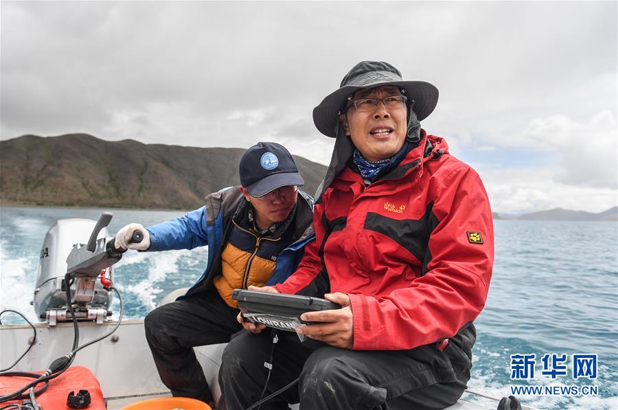 科考队成员利用导航系统乘船前往主湖区进行考察(7月22日摄)。 目前,第二次青藏高原综合科考正在对羊卓雍错进行深度测量,并测算水量。这是中国科学家首次对羊卓雍错进行全面的水深等深线测量。此次测量也是第二次青藏高原综合科考对“亚洲水塔”水量测算的一部分。 羊卓雍错简称羊湖,位于西藏山南市浪卡子县境内,距拉萨不到100公里,其自然景色优美,是西藏的热门旅游景点之一。 新华社记者 晋美多吉 摄