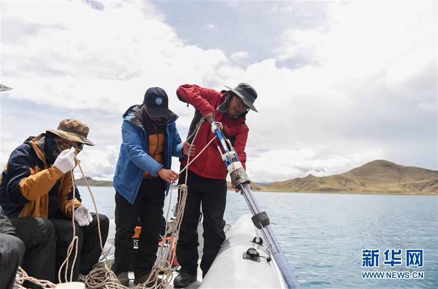 科考队员在投放重力钻,准备钻取湖泊沉积岩芯(7月22日摄)。 目前,第二次青藏高原综合科考正在对羊卓雍错进行深度测量,并测算水量。这是中国科学家首次对羊卓雍错进行全面的水深等深线测量。此次测量也是第二次青藏高原综合科考对“亚洲水塔”水量测算的一部分。 羊卓雍错简称羊湖,位于西藏山南市浪卡子县境内,距拉萨不到100公里,其自然景色优美,是西藏的热门旅游景点之一。 新华社记者 晋美多吉 摄
