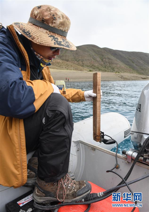 科考队员陈浩手持声纳仪器探测水下地形(7月22日摄)。 目前,第二次青藏高原综合科考正在对羊卓雍错进行深度测量,并测算水量。这是中国科学家首次对羊卓雍错进行全面的水深等深线测量。此次测量也是第二次青藏高原综合科考对“亚洲水塔”水量测算的一部分。 羊卓雍错简称羊湖,位于西藏山南市浪卡子县境内,距拉萨不到100公里,其自然景色优美,是西藏的热门旅游景点之一。 新华社记者 晋美多吉 摄