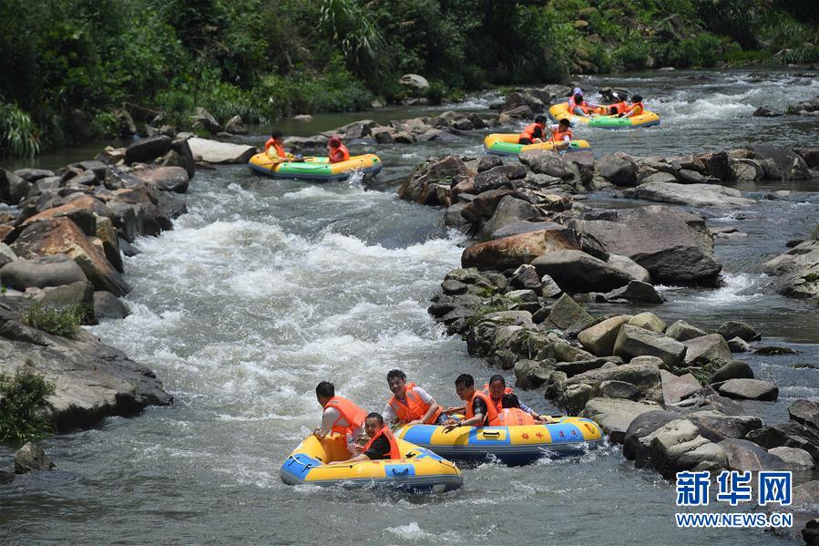 7月23日,游人在江西省南昌市梅岭大峡谷景区体验漂流。 当日是大暑节气,江西南昌的市民和游客体验周边景区的漂流旅游项目,享受清凉。 新华社记者 万象 摄