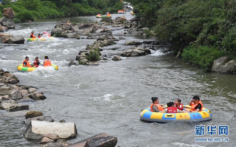 7月23日,游人在江西省南昌市梅岭大峡谷景区体验漂流。 当日是大暑节气,江西南昌的市民和游客体验周边景区的漂流旅游项目,享受清凉。 新华社记者 万象 摄