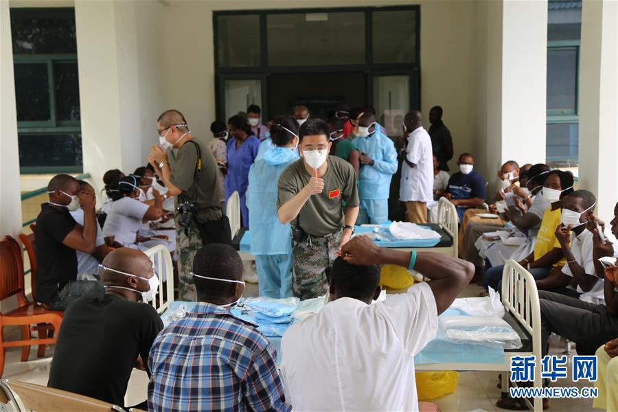 当地时间2014年9月22日,解放军援塞医疗队为中塞友好医院即将上岗的塞方工作人员开展PPE穿脱流程培训,医疗队员通过手势表扬激励塞方医务人员。新华社发(黄显斌 摄)
