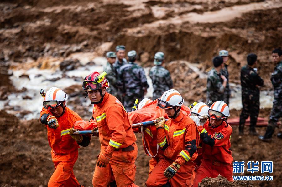 7月24日,救援人员从山体滑坡现场运出遇难者遗体。 7月23日21时20分,贵州省六盘水市水城县鸡场镇坪地村岔沟组发生一起山体滑坡。截至24日11时许,现场已搜救出22人,其中11人生还,11人死亡,初步判断34人失联。 新华社记者陶亮摄
