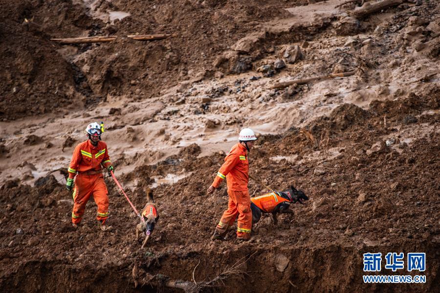 7月24日,救援人员在山体滑坡现场指挥搜救犬开展救援。 7月23日21时20分,贵州省六盘水市水城县鸡场镇坪地村岔沟组发生一起山体滑坡。截至24日11时许,现场已搜救出22人,其中11人生还,11人死亡,初步判断34人失联。 新华社记者陶亮摄