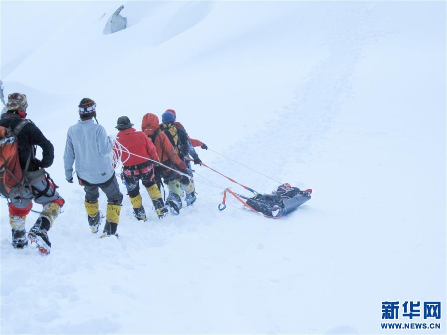 图为西藏拉萨喜马拉雅登山向导学校的向导们在珠峰进行高山救援(2010年9月17日摄)。 新华社发(扎西次仁摄)