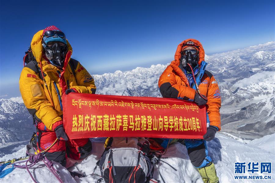 图为西藏拉萨喜马拉雅登山向导学校的向导们在珠峰顶上庆祝学校成立20周年(2019年5月24日摄)。 新华社发(扎西次仁摄)