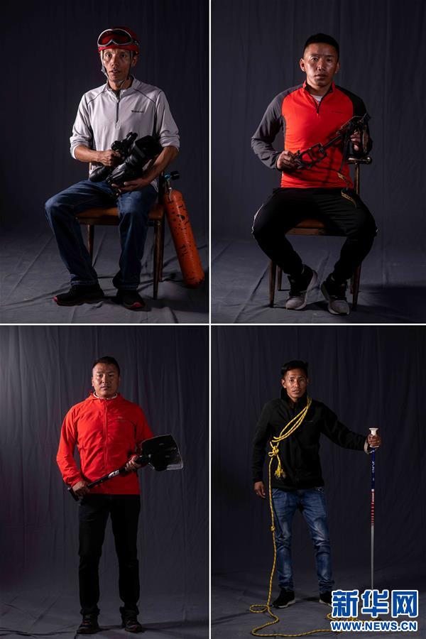 拼版照片为西藏拉萨喜马拉雅登山向导学校的向导阿旺罗布(左上)、多杰次仁(右上)、其美扎西(左下)、加布(2019年7月10日摄)。 新华社记者 晋美多吉摄