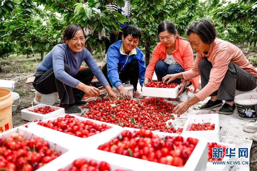 5月16日,在山西省芮城县古魏镇太安村,村民将樱桃装箱。 新华社发(肖永杰 摄)