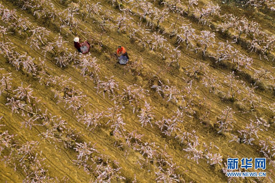 3月28日,在山西省芮城县古魏镇太安村,村民在桃园里忙碌 (无人机拍摄)。新华社发(肖永杰 摄)