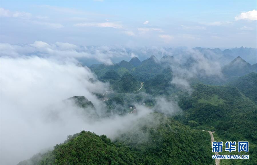 这是7月24日无人机拍摄的广西都安瑶族自治县下坳镇云雾缭绕的风景。 当日,在广西都安瑶族自治县下坳镇,云雾缭绕于群山大地之间,充满诗情画意。 新华社记者 陆波岸 摄