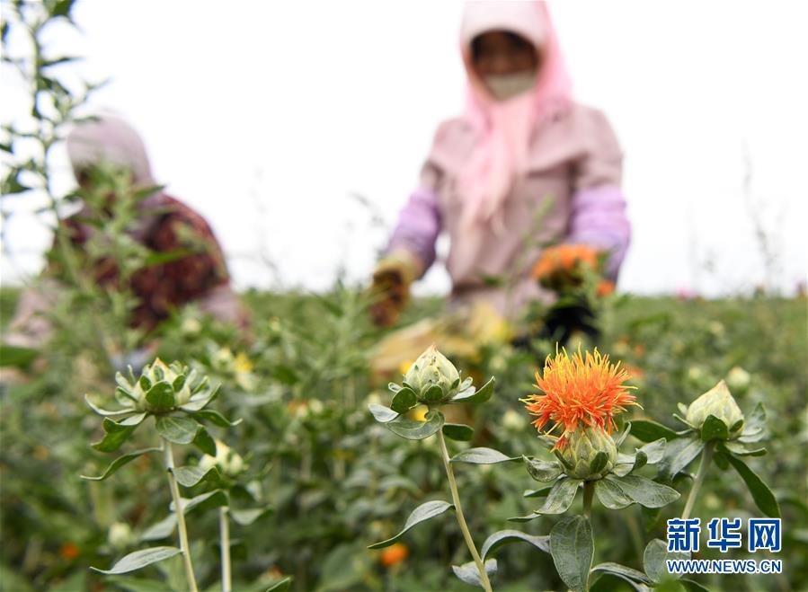 7月24日,红寺堡区中川村的村民在采摘草红花。 近日,宁夏吴忠市红寺堡区新庄集乡中川村的草红花进入采摘期。红寺堡区是我国最大的生态移民易地扶贫集中安置区,近年来当地积极优化调整种植产业结构,利用沙地和干燥的气候条件,大力发展枸杞、葡萄、药材等产业,为农户拓展增收渠道。 新华社记者 冯开华 摄