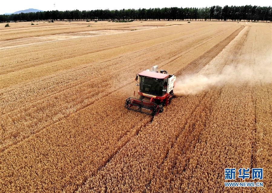 在河南省舞阳县保和乡大路李村的一处麦田里,农机手操作机械收割小麦(5月29日无人机拍摄)。 新华社记者 李安 摄