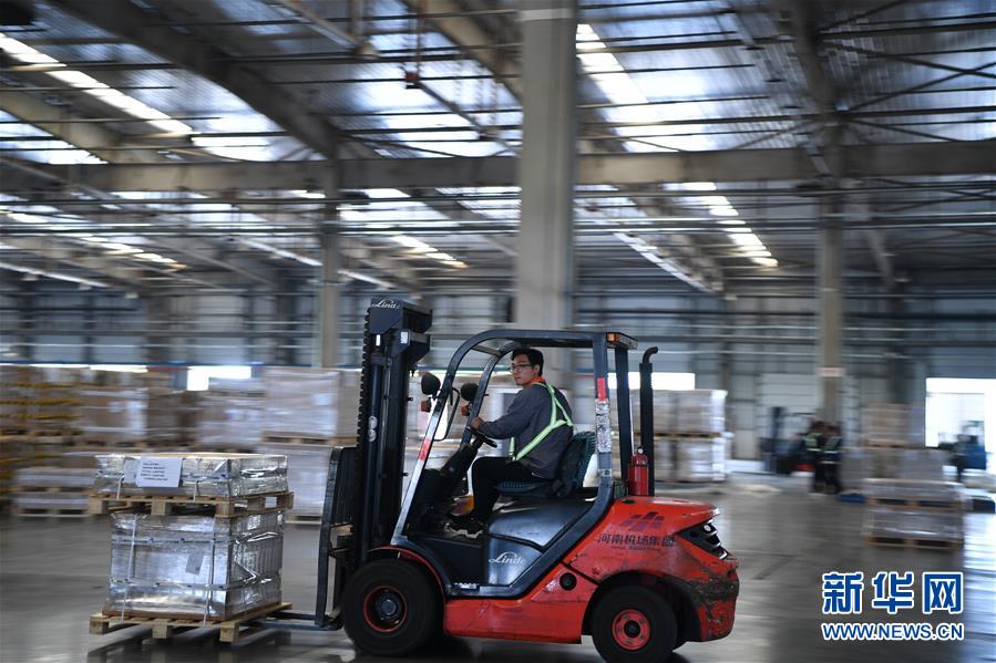 机场工作人员在郑州新郑国际机场西货站仓库内驾驶叉车(4月16日摄)。 新华社记者 李嘉南 摄