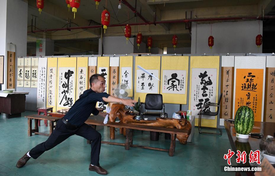 7月24日,农俊宁展示手标技艺。来自广西南宁的农俊宁,今年47岁,是壮族古狼兵特有绝技“壮王手标”传承人,自幼受家族影响,学习手标技艺。2017年,农俊宁开始专职推广这一壮族特色技法。在他手中,纸飞机、筷子等常见物品变得极具杀伤力。2018年,他曾在1分钟内将13个纸飞机扎入2米外的西瓜中,刷新吉尼斯纪录。如今,农俊宁计划建立国术工作室,将壮族古狼兵技艺文化传承下去。 中新社记者 俞靖 摄