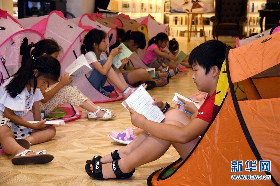 7月24日,在栈桥书店一楼的女生夜宿区,小读者在睡前读书会上阅读。暑假期间,青岛栈桥书店举行夜宿书店活动,邀请小读者们晚间走进书店亲近书籍,并通过睡前读书会、好书分享、枕书共眠等形式,培养孩子们良好的睡前阅读习惯,爱读书、读好书。 新华社记者 李紫恒 摄