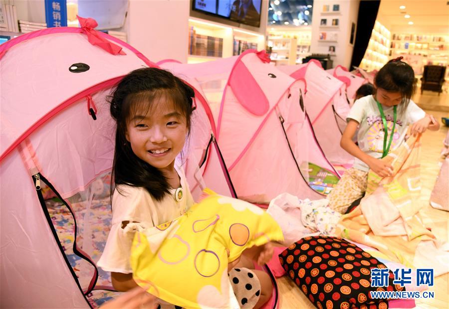 7月24日,在栈桥书店一楼的女生夜宿区,女孩在独立铺寝具。暑假期间,青岛栈桥书店举行夜宿书店活动,邀请小读者们晚间走进书店亲近书籍,并通过睡前读书会、好书分享、枕书共眠等形式,培养孩子们良好的睡前阅读习惯,爱读书、读好书。 新华社记者 李紫恒 摄