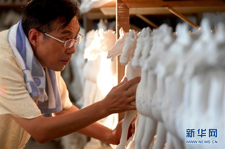 在河南省洛阳市孟津县南石山村的仓库内,高水旺在查看唐三彩素胎(7月23日摄)。新华社记者李安摄