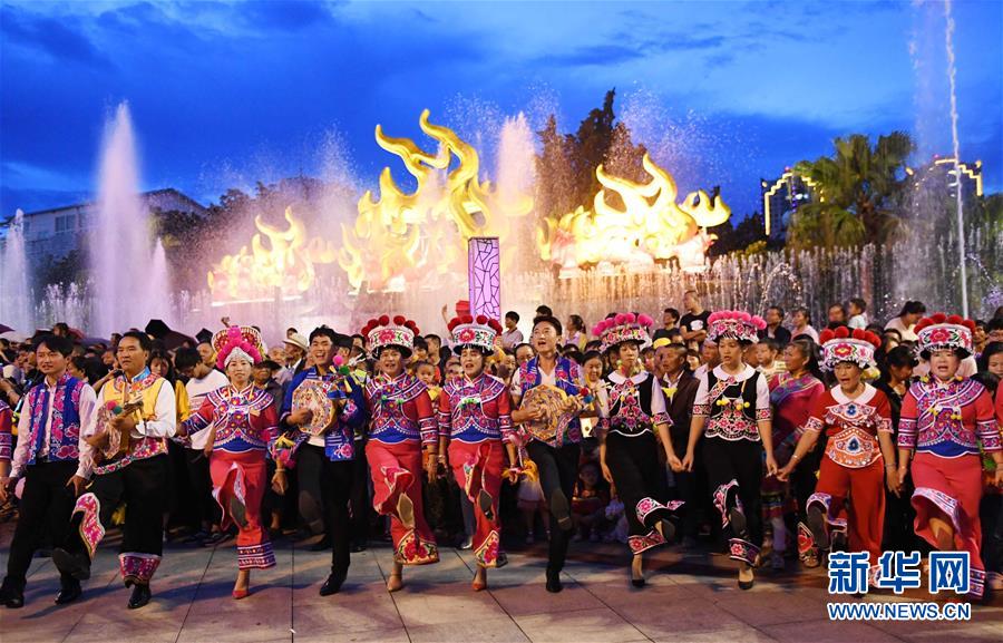7月26日,人们在云南楚雄桃园湖广场载歌载舞欢庆火把节。 当日,云南省楚雄彝族自治州楚雄市彝人古镇、太阳历文化公园、市民休闲广场等公共场所,人们身着节日盛装,载歌载舞,欢庆彝族群众的火把节。 新华社记者 杨宗友 摄