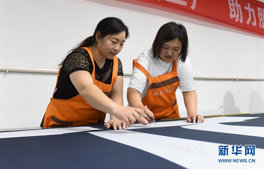7月28日,通过“扶贫专岗”就业的村民在威县鸡泽屯村一家服装加工厂裁剪服装布料。 近年来,河北省威县把产业扶贫、就业扶贫作为脱贫攻坚的重要抓手,通过“扶贫专岗”就近安置、鼓励灵活就业等多渠道开展扶贫工作,让有就业能力和意愿的贫困群众在家门口实现就业,形成贫困户稳定增收的长效机制。目前,威县已通过“扶贫专岗”帮助6000余名农村群众实现就近就业增收。 新华社记者 朱旭东 摄