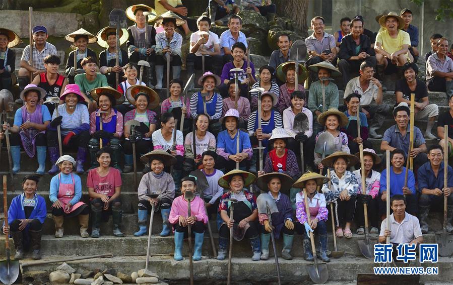 参与乌英苗寨芦笙坪施工的村民合影,其中大部分是妇女(7月24日摄)。 新华社记者 黄孝邦 摄