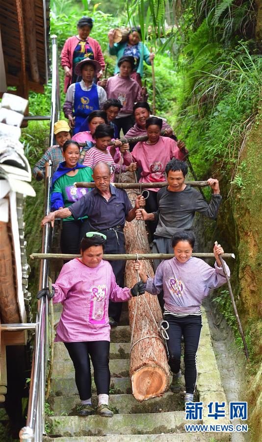 几位乌英苗寨村民合力抬运用于建设新木楼的木头(7月1日摄)。新华社记者 黄孝邦 摄