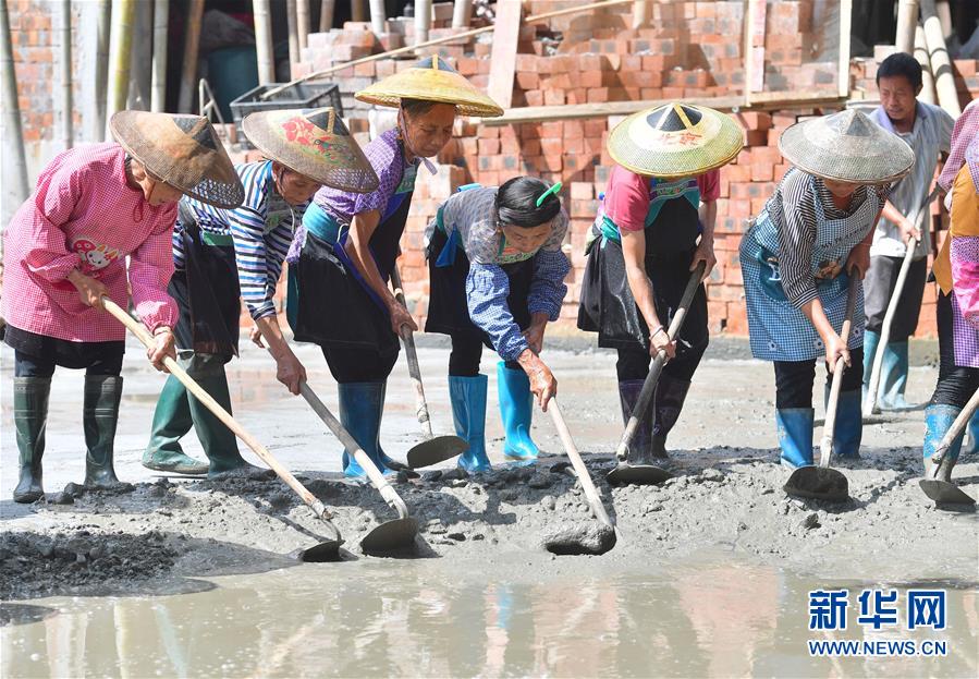 几位妇女在乌英苗寨芦笙坪施工现场劳动(7月27日摄)。 新华社记者 黄孝邦 摄