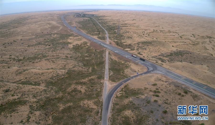7月28日,在内蒙古鄂尔多斯市杭锦旗,新修的双向四车道穿沙公路,与第一条穿沙公路(窄旧公路)交汇(无人机拍摄)。 新华社记者 刘诗平 摄
