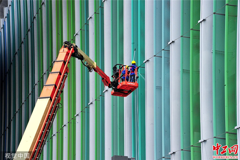 2019年7月28日,上海,第二届中国国际进口博览会已进入倒计时,工人们在登高作业清洗场馆的外立面。 图片作者:杨奕/视觉中国